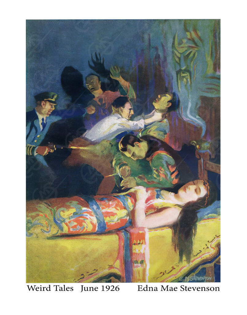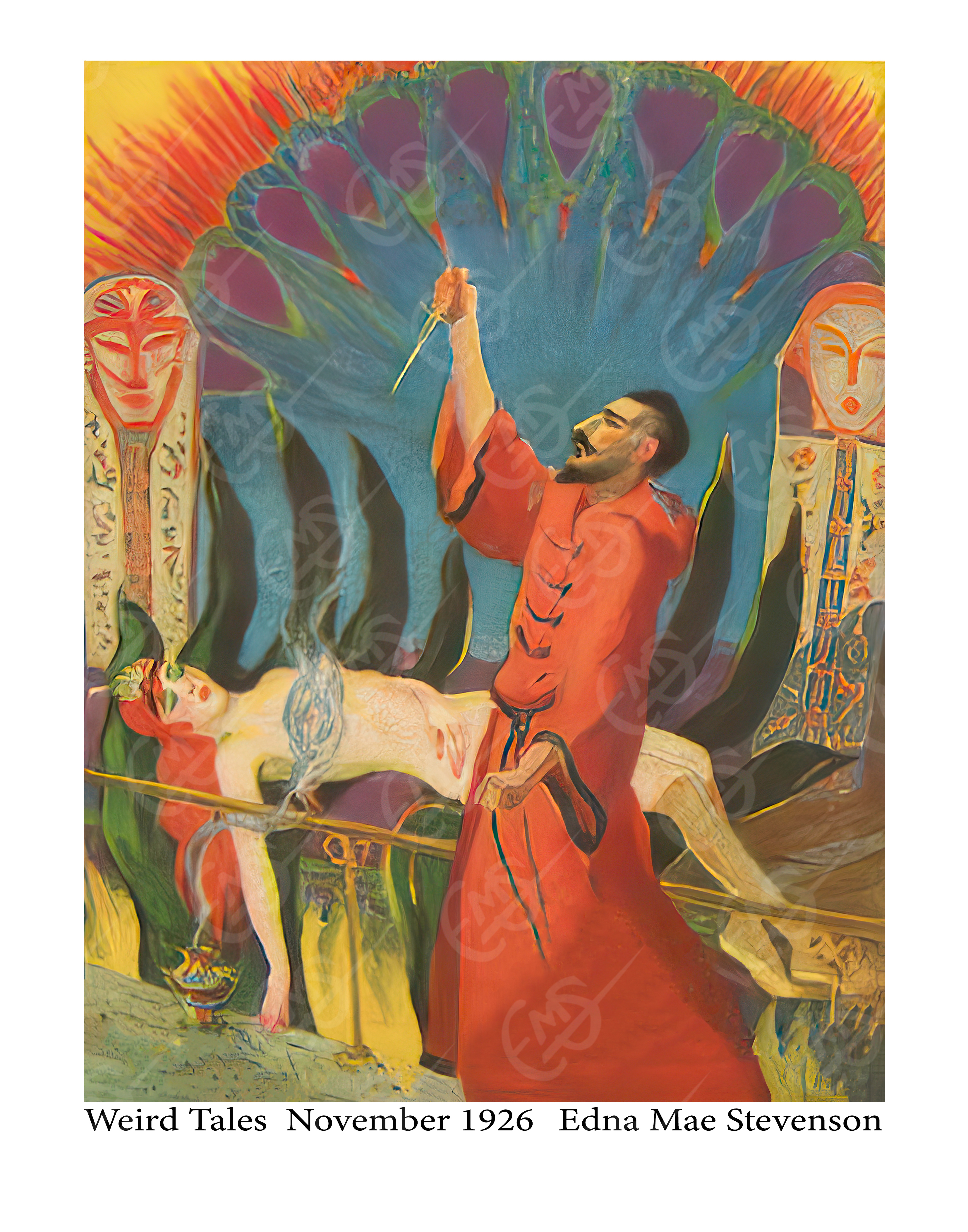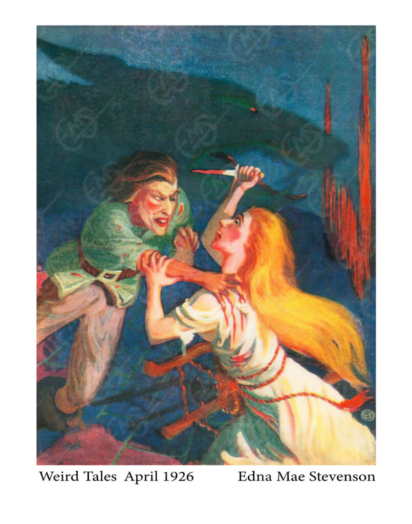 She contracted for 5 covers in 1926 for Weird Tales. At the time many magazines were making the push towards more salacious covers to attract the male audience. Considering her keen moral sense, she would do no more covers after her last cover in November 1926 (that can be found) where a young lady was naked on an altar covered by nothing but a wisp of smoke. This cover (from June 1926) is her best.