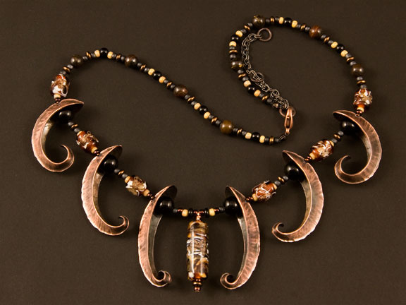 The copper ornaments were made by a process called foldforming. The larger glass beads were all lampworked by hand using colored glass rods and a torch.