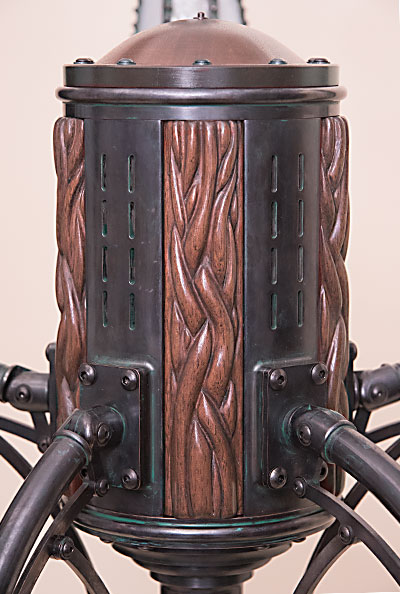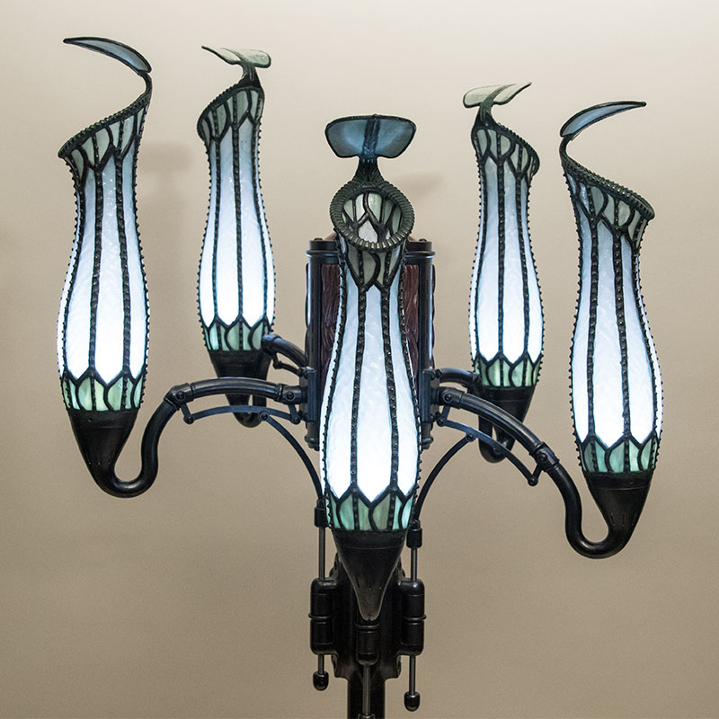 Stained glass was kiln formed into 3D shapes, precision cut, and joined with copper foil and solder to make the lamp heads. The metal parts were either cast in bronze from custom 3D printed waxes, or CNC milled. The wooden parts were turned, CNC milled, and/or hand carved.