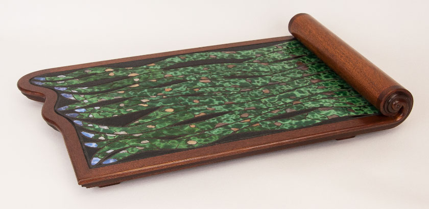 This tray was made from various woods including mahogany and Peruvian walnut, with turned and carved details. The stained glass is inlaid as a mosaic.