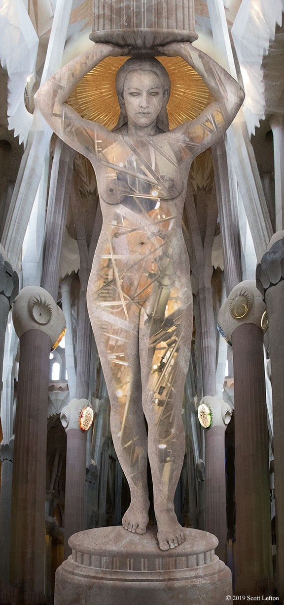 The imagery is a mixture of person, digitally manipulated stone, miscellaneous sculpture, and the Sagrada Familia cathedral in Barcelona, Spain.