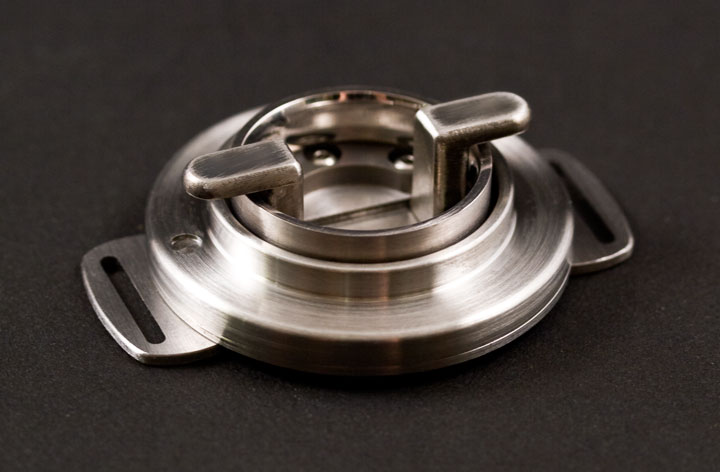 This is one of a pair of machined stainless steel puzzles that were made to hold white gold wedding rings.