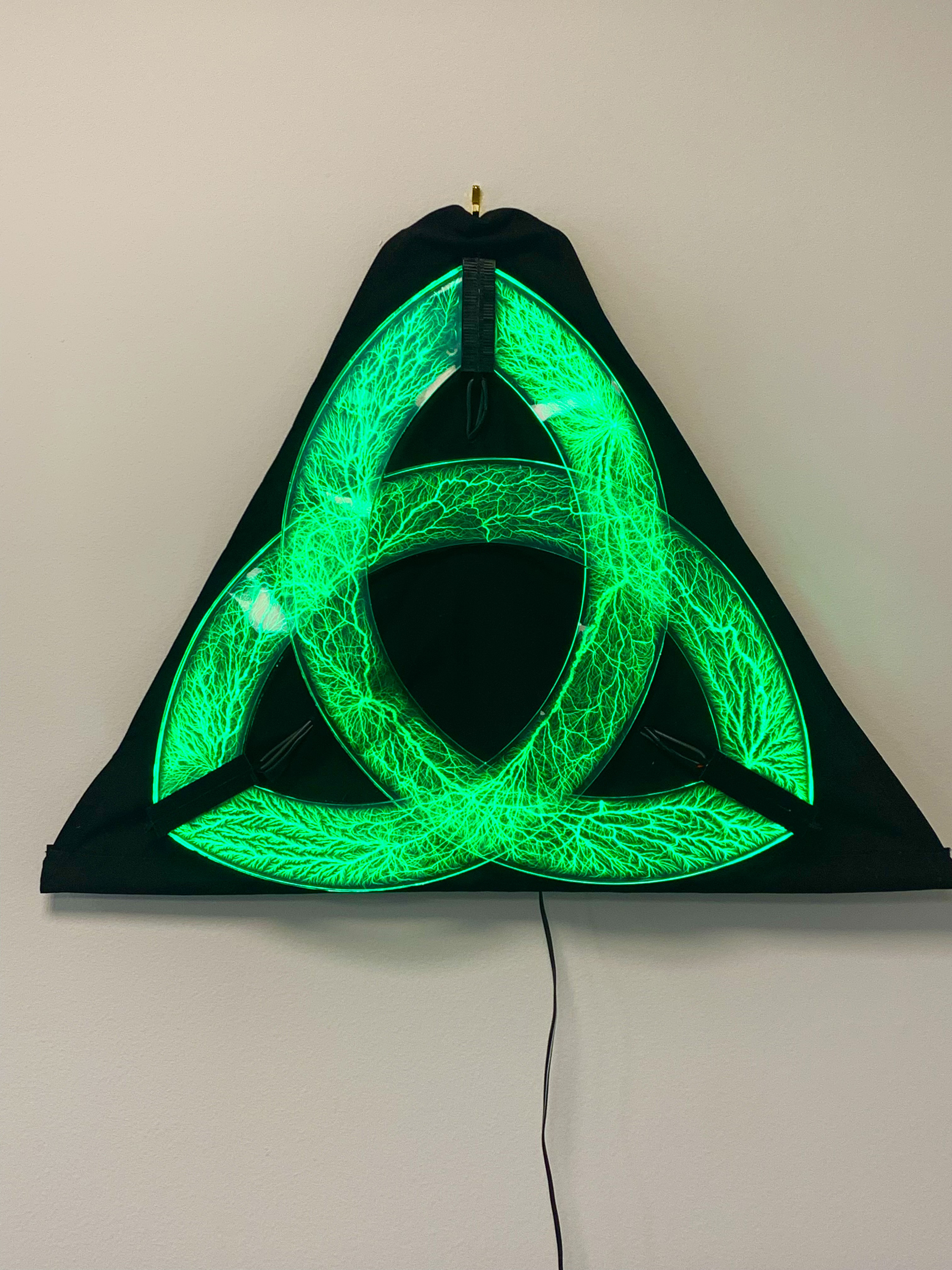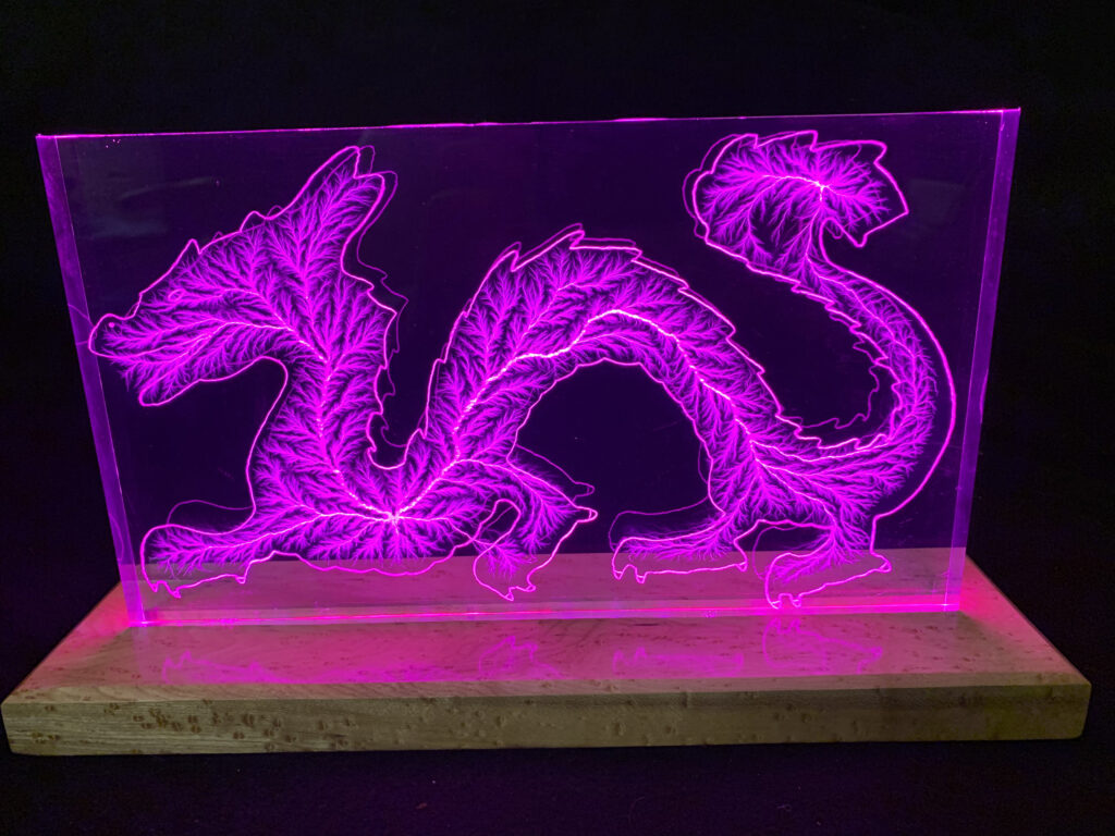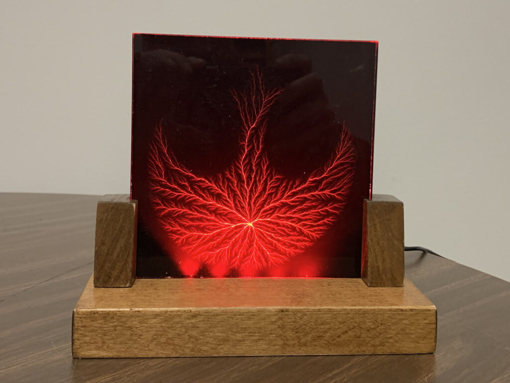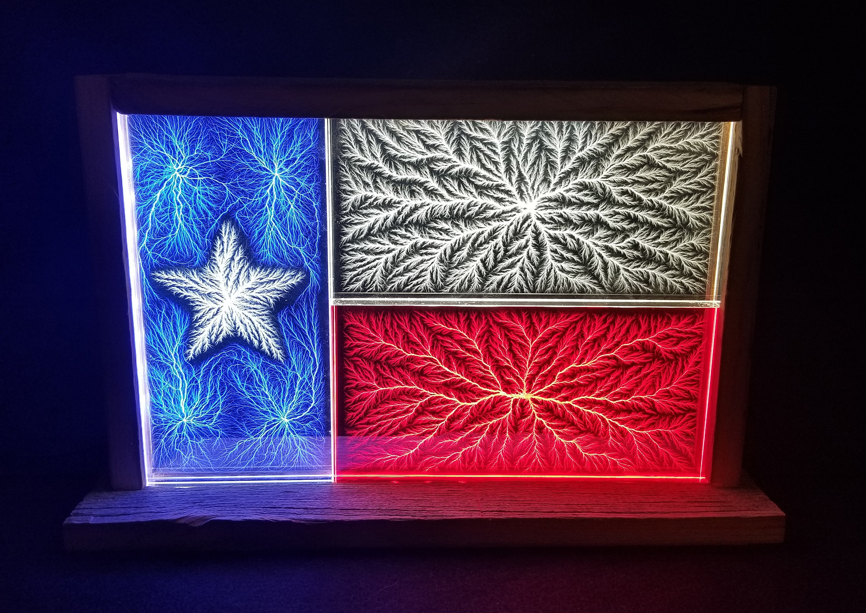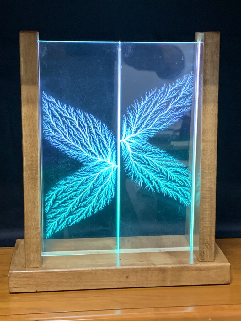 A few years after seeing my first Lichtenberg figure at an art show I had an opportunity to begin making some of my own. Lichtenberg figures are branching patterns created on the surface or interior of an insulating material by a high voltage electrical discharge. After making many rookie mistakes and receiving valuable coaching from others who developed this art form years before me, I am now designing, exposing, and mounting my own unique pieces. I love the challenge of making the discharge flow through the piece in a natural way and creating a beautiful image in what was originally an empty piece of acrylic. I have advanced to stacking several pieces together to allow multiple colors at once as well as to bending and shaping some pieces to add extra dimensions. I have also experimented with adding background colors and other media like LED lights for additional enhancements. I am always keeping one eye open looking for an image or shape to inspire my next piece.
